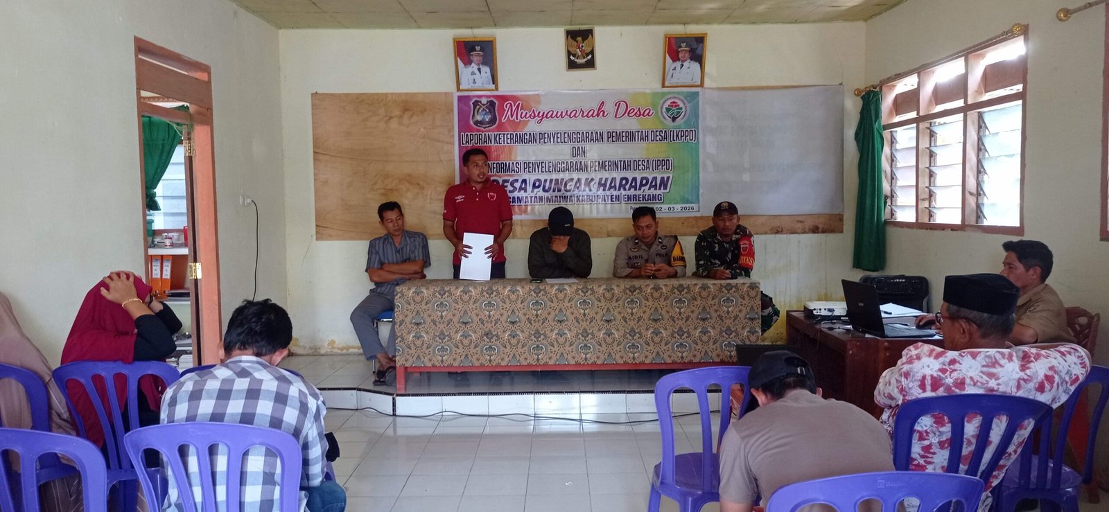 Polresenrekang.com – Bhabinkamtibmas Polsek Maiwa Desa Puncak Harapan Aiptu Aidil menghadiri kegiatan Musyawarah Desa terkait Perubahan Peraturan Kepala Desa tentang Penjabaran APBDes Tahun 2026 yang dirangkaikan dengan Laporan Penyelenggaraan Pemerintahan Desa Tahun Anggaran 2025 serta Laporan Tutup Buku BUMDes Tahun 2025, pada Senin (2/3/26) bertempat di Kantor Desa Puncak Harapan.