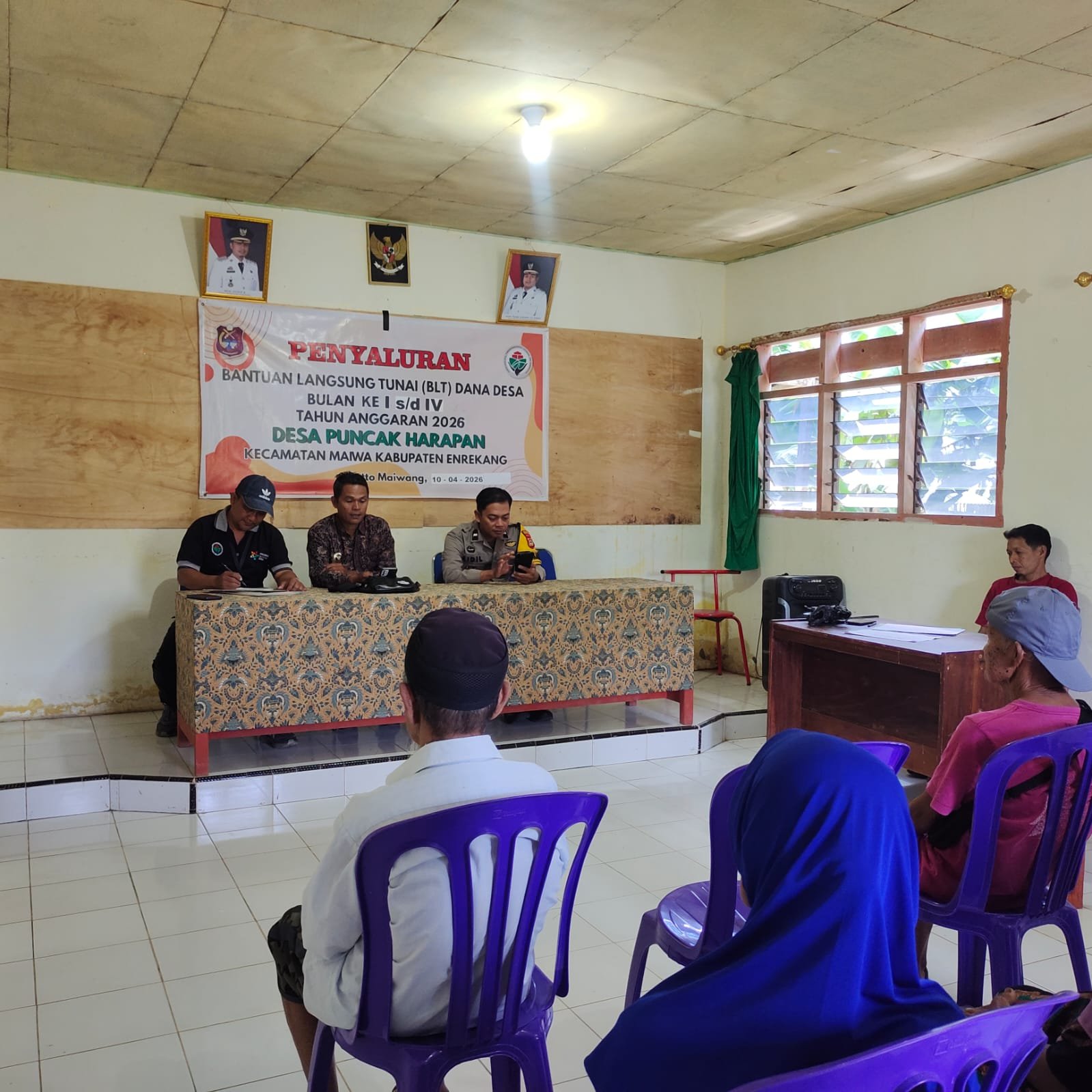 Polresenrekang.com – Bhabinkamtibmas Polsek Maiwa Desa Puncak Harapan Aipda Aidil menghadiri kegiatan penyaluran Bantuan Langsung Tunai (BLT) Dana Desa untuk bulan Januari, Februari, Maret, dan April Tahun 2026 yang dilaksanakan di Kantor Desa Puncak Harapan, Kecamatan Maiwa. kabupaten Enrekang, pada hari Jumat (10/04/2026).