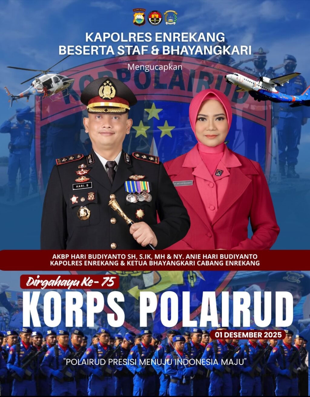 Polresenrekang.com–Dalam momentum peringatan Hari Ulang Tahun ke-75 Korps Kepolisian Air dan Udara (Polairud) yang jatuh pada 1 Desember 2025, Polres Enrekang melalui Kapolres beserta jajaran dan Bhayangkari menyampaikan ucapan selamat serta apresiasi mendalam atas dedikasi Korps Polairud dalam menjaga keamanan wilayah perairan dan udara Indonesia.
