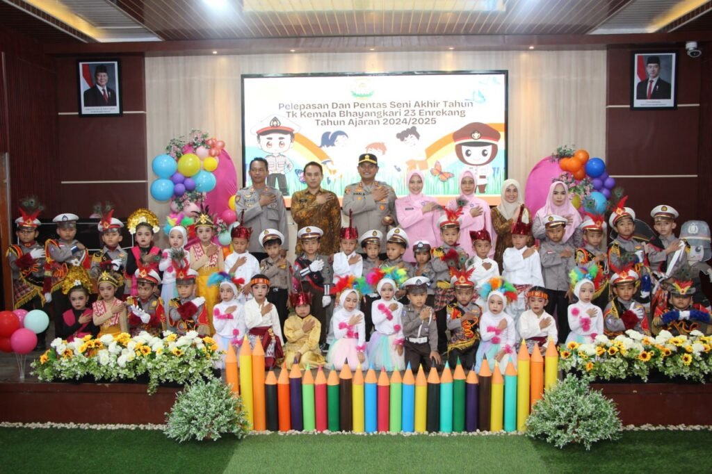 Polresenrekang.com–Dalam suasana penuh haru dan kebahagiaan, Kapolres Enrekang AKBP Hari Budiyanto, S.H., S.I.K., M.H., selaku Penasehat Yayasan Kemala Bhayangkari 23 Enrekang, memimpin langsung prosesi penamatan dan perpisahan murid-murid TK Kemala Bhayangkari 23 Enrekang yang digelar di Aula Wira Pratama Mapolres Enrekang, Kamis (19/06/2025).