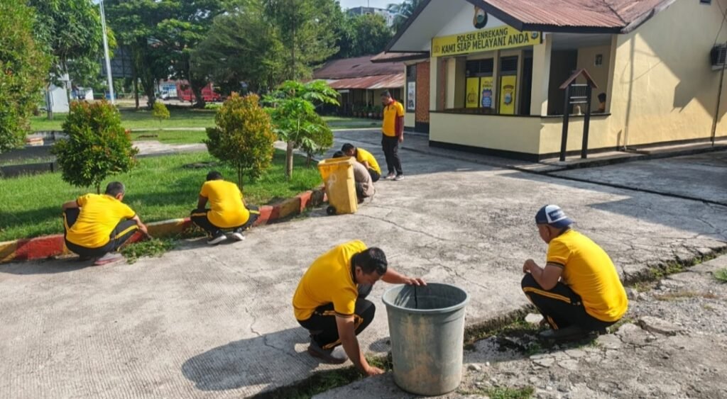Polresenrekang.Com Dalam rangka menciptakan lingkungan yang bersih dan nyaman, Personel Polsek Enrekang melaksanakan kegiatan kerja bakti atau Kurvei bersama di halaman Mako Polsek Enrekang Pada hari Jum’at (03/10/2025).