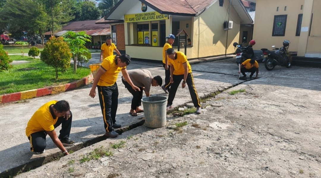 Polresenrekang.Com Dalam rangka menciptakan lingkungan yang bersih dan nyaman, Personel Polsek Enrekang melaksanakan kegiatan kerja bakti atau Kurvei bersama di halaman Mako Polsek Enrekang Pada hari Jum’at (03/10/2025).