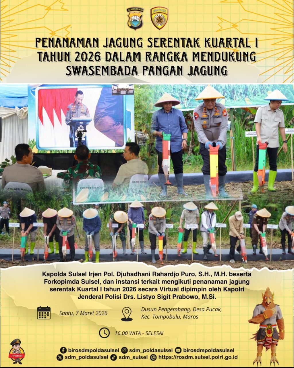 Karo SDM Polda Sulsel Kombes Pol Adi Ferdian Saputra mengatakan bahwa kegiatan penanaman jagung serentak ini merupakan wujud nyata dukungan Polri terhadap program pemerintah dalam memperkuat ketahanan pangan nasional, khususnya di seluruh wilayah Sulawesi Selatan dan sebanyak 16.5 Hektar lahan ditanami jagung diseluruh Polres jajaran.