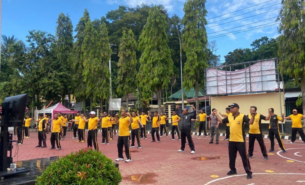 Olahraga senam sehat yang dipandu wakapolres dan diiringi musik enerjik. Gerakan peregangan, aerobik, hingga pendinginan dijalani dengan penuh antusias para personil.